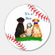 Baby shower treats with a baseball theme. A baby sitting next to two dogs, a black lab and a yellow lab.