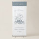 This welcome banner features a vintage illustration with birds feathering their nest and is sure to add a touch of whimsy and elegance to your baby shower, sprinkle or brunch. Welcome guests with this beautiful retractable banner. The soft dusty blue is perfect for welcoming baby boy. Simply change the name and date to customize!