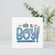 A card design depicting the phrase "it's a boy" in a quirky handwritten font. The letters are coloured with a blue gradient and are accompanied by an off-centre, bold, black outline to make the colours pop. The design sits on a simple, but effective, white background.