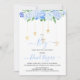 It's a boy, flowers and baby objects bouquet, baby boy shower party invitation: Blue white and gold colors.
