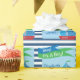 This baby shower gift wrapping paper features a nautical theme. A background of dark blue and white horizontal stripes is accented with green and blue waving flags and a cute sailboat. The text on the flags reads: Ahoy! It's A Boy! Customizable text allows you to add the mother's name.