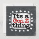 "It's A Gen Z Thing" is a cute text design in gray with black and red text, along with a white accent shape and white textured whimsical dots surrounding it.