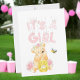 Adorable typography, "It's a Girl" baby shower design featuring a cute girl teddy bear with a barrel of honey watching a cute honey bee. The fun pink lettered typography is strung at top with cute strings and dangle down. Pink florals and templates to create your own invitation on back. *NOTE: Check collection or store for digital download option!
