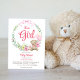 It's a girl teddy bear floral arch baby shower invitation template. Cute teddy bear with a pink ribbon and pink balloons for girls baby shower.
