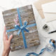 Rustic wood, white, blue and gold snowflakes, It's a Wonderful time of the Year Holiday Christmas gift wrap.