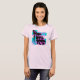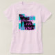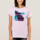 This design is for women who love shoes. A platform stiletto is on a geometric background. The slogan is written across the background and the shoe. Designed in medium blue, black, and fushcia, it works well on most colors.
