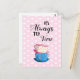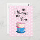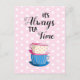 "it's always tea time" tea party quote postcard. Perfect for afternoon tea, high tea, and tea party. Features a cute stacked tea cups digital illustration in pink and blue. Digital illustration by Kristine Lee. For more, visit www.kristineleedesigns.com