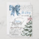 Featuring a soft, blue bow adorned with delicate snowflakes and a snowy pine tree, this design exudes a modern yet classic winter wonderland vibe, complete with the charming script "Baby it's cold outside" message. These baby shower invitations are easily customized for your event by simply adding your details.