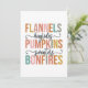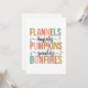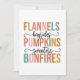 This colorful and fun fall design features a list of autumn favorites, including "Flannels," "Hayrides," "Pumpkins," "Sweaters," and "Bonfires." The text is presented in a bold, uppercase font with each word filled in with a different warm, earthy hue—ranging from soft pinks and oranges to muted greens and blues—perfectly capturing the cozy and vibrant spirit of the season. The words "hayrides" and "sweaters" are written in a flowing script, adding a touch of elegance and creating a nice contrast with the bold block letters. Decorative flourishes frame the script text, adding to the overall charm and appeal. This design is perfect for fall.