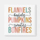This colorful and fun fall design features a list of autumn favorites, including "Flannels," "Hayrides," "Pumpkins," "Sweaters," and "Bonfires." The text is presented in a bold, uppercase font with each word filled in with a different warm, earthy hue—ranging from soft pinks and oranges to muted greens and blues—perfectly capturing the cozy and vibrant spirit of the season. The words "hayrides" and "sweaters" are written in a flowing script, adding a touch of elegance and creating a nice contrast with the bold block letters. Decorative flourishes frame the script text, adding to the overall charm and appeal. This design is perfect for fall.