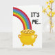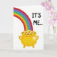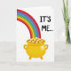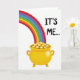 This card shows a golden pot near the bottom center, overflowing with shiny gold coins that look like they’re tumbling forward. A wide rainbow arches above it in clear bands of red, orange, yellow, green, blue, indigo, and violet, curving down as if it’s pouring its color straight into the treasure ☘️. The background stays white and bright, keeping the focus on the pot’s warm yellows and the rainbow’s strong stripes. The simple, open space around the artwork gives the scene room to breathe, like a quiet moment you’d point out to a close friend with a knowing smile 💚. In the upper right area, the words “IT’S ME...” appear in dark lettering, standing apart from the illustration and catching your eye first. That text feels like a teasing introduction, as if the “me” is the lucky one waiting just off the page, leaning in with a friendly, flirty confidence. The rainbow’s arc is smooth and centered, and the pot’s rounded shape sits firmly below it with coins clustered in the opening and scattered along the rim.