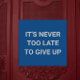 "It's never too late to give up" is a funny sassy demotivational quote here on a blue base.