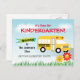 This back to school postcard features a design of a school bus with a banner reading: Welcome! The text at the top reads: It's Time for Kindergarten! Customizable text near the bottom allows you to add teacher's name, and school. The background is blue sky with white fluffy clouds, green grass and two cute smiling flowers.