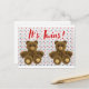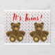 You've just had twins, so it's time to get the word out. "It's Twins!" birth announcement featuring twin stuffed bear cubs is a perfectly cute way to send the happy news to friends and family members. Red, white, and blue starry pattern background and bold red lettering.