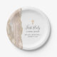 The left-hand edge of this elegant paper plate features an ivory watercolor agate border trimmed with faux gold glitter. A faux gold foil cross appears above the customizable text, which combines handwriting, copperplate and italic fonts in charcoal gray on a white background. Personalize it with the name of the guest of honor and the date.