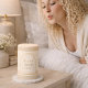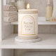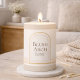 Feminine minimalist pillar design with an ivory label, featuring a blush arch framed by a thin gold outline and modern serif lettering. Designed for shelves, mantels, and styled trays, this candle complements neutral interiors and layered home styling.