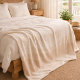 Beach inspired neutral textile in ivory with overlapping blush beige wave forms and fine taupe edging. The layered shoreline pattern adds soft dimension while keeping a light summer palette. Designed for draping over a linen sofa, folding at the foot of a bed, or styling a breezy coastal guest space.