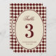 This ivory & burgundy checkered wedding table number features a heritage-style checker pattern in deep burgundy and soft cream tones for a warm, vintage-timeless look. The mix of playful-retro character and elegant contemporary typography creates an understated old-money fall / winter mood with subtle whimsical charm. Designed to coordinate beautifully with the Ivory & Burgundy retro suite, it brings classic nostalgia to a modern table setting.