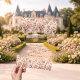 A clear, transparent background. Decorated with ivory and rose gold colored roses, flowers. Personalize and your names and details.