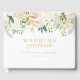 An elegant and romantic wedding guestbook design featuring a watercolor botanical frame in watercolor ivory and pink flowers and green foliage.