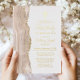 The left-hand edge of this elegant modern first communion invitation features an ivory watercolor agate border trimmed with gold faux glitter. A small cross appears above the customizable text, which combines handwriting, copperplate and italic fonts in real gold foil on a white background. The reverse side features a matching ivory and gold agate design.