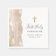 The left-hand edge of this elegant napkin features an ivory watercolor agate border trimmed with faux gold glitter. A faux gold foil cross appears above the customizable text, which combines handwriting, copperplate and italic fonts in charcoal gray on a white background. Personalize it with the name of the guest of honor and the date.