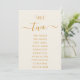 In the upper part, there is the table number written in a handwriting script and the word Table above, in smaller caps (hand letters). Under them, there are the 10 guest names, in similar hand letters. All text is red, the background is ivory.