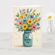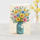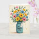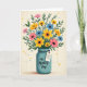 This card features a joyful bouquet arranged in the center, rising from a sturdy teal container shaped like a classic glass jar. The flowers open in sunny yellow, soft pink, and calm blue, each with a darker center that makes the petals stand out like they’re leaning in close together, the way good friends do ❤️. Deep green leaves and stems weave through the blooms, adding fullness and a cozy, gathered-from-the-garden look. Across the front of the teal container, a flowing cursive-style word appears in a darker ink, placed horizontally and easy to spot. A small cream-colored tag hangs from the rim on a thin tie, its tiny lettering faint and hard to read, like a private note meant for just the two of you 👩. The background is warm ivory with a subtle texture and faint grid lines that keep the scene calm and orderly. Small scattered dots in yellow, orange, and blue float around the bouquet like confetti, with a soft shadow beneath the container.