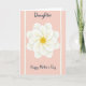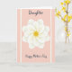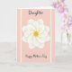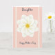 This design shows a large white flower with many softly shaded petals, layered so they feel gently folded together like a careful embrace ❤️. A warm golden-yellow center glows against the pale petals, drawing your eye inward like a quiet, affectionate glance. The background is a muted blush-pink, setting a tender, close-to-the-heart mood without needing any extra elements. Slim ivory vertical stripes sit along the left and right edges, adding a refined frame that keeps the focus on the bloom. Near the top, the word “Daughter” appears centered in a flowing, artistic style in a light ivory tone. Near the bottom, “Happy Mother’s Day” is centered in matching light ivory lettering, balanced beneath the flower as a steady, loving reply 🌼. The composition feels calm and intimate, with the flower centered on the blush field between two narrow ivory side stripes.