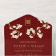 Oriental peach / plum blossoms, spring flowers in cream / ivory / white on a dark burgundy red / matte brass gold background with a simple rectangle double happiness symbol wedding all-in-one invitation card. An elegant and romantic floral chinese themed wedding design which is whimsical, modern and classy.