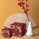 Oriental peach / plum blossoms, spring flowers in cream / ivory / white on a dark burgundy red / matte brass gold background with a simple rectangle double happiness symbol wedding party favor gift box. An elegant and romantic floral chinese themed wedding reception card design which is whimsical, modern and classy.