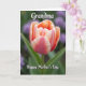 This greeting card features a close-up photo of a two-toned flower that feels like a gentle spring moment shared between loved ones ❤️. The petals blend soft peach, creamy ivory, and coral-pink, opening in layers that look like they’re leaning in toward each other with quiet affection. Deep green leaves sit beneath the bloom, grounding it like a steady companion in the scene. The background fades into muted greens with a faint touch of lavender, softly blurred so the flower stays the focus. Light falls across the petals in a warm, tender glow, highlighting fine lines and color transitions. A short message in a flowing, cursive-style font appears above the flower in a light, subtle tone, with a second line placed below in the same color to frame the image 🌼. The overall layout keeps the text spaced comfortably so it doesn’t cover the center of the bloom. The flower sits centered with crisp focus, while the edges dissolve into a soft bokeh of green and lavender.
