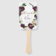 Beautiful floral wreath, wedding hand fans. Elegant plum purple and ivory white flowers with rich green and golden leafy greenery. Back features solid plum purple color background and lines of white text for a detailed list of the wedding party.