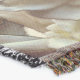 A quality printed throw has its advantages. This is a much finer weave throw than its loopier cousins, and though lighter, it is worth the investment for custom room accessorizing. The back is much prettier than the typical brown, and the fringe on the long sides very vivid, the selvage nicely done. Before photographing, I washed the throw in cold water, delicate, with a thicker woven throw the same size. On tumble dry low, this throw was dry in half the time as the other. This is a very practical quality if you use throws for furniture covers or to wrap up in frequently. The sleekness of the fabric makes it a great layer for accenting or protecting without the feeling of sitting on too much stuff. Perfect for napping or when you feel a light chill coming on. The color printing is beautiful and on this fabric, matched the design and color of my Photoshop image. This is an advantage for blending room fabrics and colors. The fringe on the short sides prints the colors from the design image and therefore varies from the side fringe. I streaked a white fractal line through the plaid pattern to give the illusion of weaving. This printed as crisp as an illusory thread, and put some white in the short side fringe, showing another advantage of print vs loomed- for artistic purposes, line lines, detail, and color integrity can be planned and preserved. My loomed throws have color limitations and more of a needlepoint texture. Print throws reproduce an exact image. The throw felt a little stiff straight out of the package, but this went away in the first delicate wash. Of course I searched the wash water for ink or bleeding and there was none.
