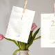Elegant, fresh and modern. This simple and elegant table number card with guestlist features a whimsical line drawn blush rpink ose and a contemporary set of fonts in a faux gold, against a light ivory background. The front design is repeated at the back for better table visibility. Alternatively mount the full set of cards together on a display board. This design includes 10 names, however 12 names (max) still fits.