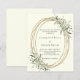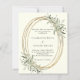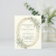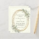 An ivory colored background decorated with sage green greenery. A faux gold frame. Personalize and add your names and details.