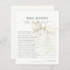Elegant ivory white bow “Who Knows the Bride Best” game card featuring chic script typography on a clean background. Perfect for adding a fun, interactive touch to a bridal shower, wedding shower, or bachelorette party, especially for bow-themed or black-and-white celebrations. Guests answer lighthearted questions about the bride, making it a memorable keepsake. Coordinates beautifully with matching invitations, signage, and party accessories in the same ivory bow design.