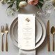 Stylish and chic with minimalist appeal. This wedding menu features a lovely floral rose bouquet alongside a contemporary set of fonts in olive green, against ivory and white backrounds.