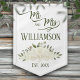 This pennant flag is beautiful, stylish, and fun. Designed to celebrate the newlyweds, it features an elegant boho chic design with a cluster of hand painted watercolor roses and blossoms in shades of ivory, cream, and white. The olive or dark sage green text reads: Mr. and Mrs. with the couple's last name as well as a cute "established" spot for the wedding year. Wonderful as decor for the wedding reception, or as a gift for the new couple.