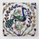 An Iznik tile with a peacock and flower sprays, Turkey 17thC. Made of green, blue, purple painted pottery.