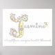 Pretty J monogram art name poster perfect for a girls bedroom or playroom in shades of grey, white, yellow, pink and purple. Personalize with your child's own name beginning with J, and name meaning for a truly personalized unique gift for your child's bedroom or nursery, this example is for the name J Jasmine A sweet flower, courageous, honest & determined. Cute poster print ideal for a new baby, christening or baby shower gift. © Unique letter J monogram hearts and flowers drawing and graphic art design by Sarah Trett. www.sarahtrett.com for www.mylittleeden.com