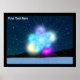 A multi-colored random fractal which resembles Jack Frost ice patterns on a window pane; superimposed on a wintery, night background. The glowing blobs of color, elements of the original fractal image, are a nice plus. Customize by adding your own text. Those patterns on your windows during winter appear as water vapor crystallizes. The patterns are caused by slight changes in the temperature of the air, but other factors, related to the formation of snow and other forms of frozen precipitation, also contribute to variations in design. They often begin when a film of condensed moisture is frozen by a puff of cold air, and the glass gets a thin sheet of ice. Perhaps another film of moisture forms and trickles down, cutting ditches and tiny streams through the underlying ice, while another puff of cold air freezes this moisture. New frozen vapor molecules may add microscopic ice crystals. The freezing and melting process repeats again and again. Bit by bit the subtle weather conditions etch the window panes with patterns. Like snowflakes, frost needs a nucleus around which to form. Ice crystals form on dust, small bumps and imperfections in a windowpane, or the texture of plants. Then frost grows as more ice crystals form on the ones that have gotten started. It can make fanciful feathery or spiky patterns. In contrast, when water vapor condenses into water droplets on a cold windowpane and these droplets then freeze slowly, the ice has a different look, as seen in the close-up photo of frozen condensation droplets. The large bubble-like shapes in the photo are frozen condensation droplets, and the many small lines on their surface are cracks that formed as the ice froze and expanded.