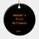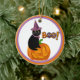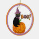 Decorate your Holloween tree with this cute personalized keepsake ornament. The design features a Jack O Lantern with a black cat sitting on it and a graphically designed word Boo! On the back is where you will personalize with your own text.