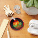 This is an image of a Jack O Lantern all dressed up. An orange pumpkin with a red witches hat is sitting on a bed of green leaves. The Jack o Lantern is lit up with bright eyes and a smile. A black backround was also added so you can see his reflection. A red border was added. These key chains are available in assorted styles and sizes.
