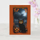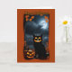 This whimsical Halloween card showcases a playful blend of a black cat and a jack-o'-lantern, both glowing eerily under the light of a full moon. The cat's face appears as a carved pumpkin, adding a unique and humorous twist to the classic Halloween imagery. The dark, cloudy night and autumn leaves set the perfect spooky atmosphere, making it an ideal choice for anyone who enjoys a bit of mischievous fun during Halloween. The "Happy Halloween" greeting on the cover makes it a great card for sending festive cheer with a touch of mystery.