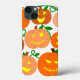 This phone case has a design of jack-o-lanterns with different faces repeating in each quarter.