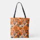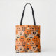 This tote bag has a design of jack-o-lanterns with different faces repeating in each quarter.