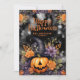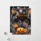 Beautiful Halloween card featuring a jack-o’lantern wearing a black witch hat and purple and orange flowers. Easily personalize this Halloween card with your family name and text.