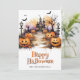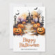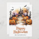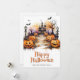 Happy Halloween card featuring watercolor illustrations of jack o’lanterns, bats, ghosts and a haunted mansion. Easily personalize this spooky Halloween card with your family name and text.