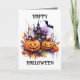 The front of this Halloween greeting card features two grinning Jack o' lanterns. Behind the Jack o' lanterns is a tall haunted house with glowing windows. The inside of the card has text fields for your personal message, plus dead trees, a black raven, and a flying bat. Make it say whatever you'd like, or leave it as is...the choice is yours! Appropriate for kids or adults.